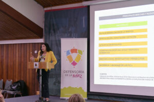 Gabriela Jorquera, coordinadora regional de la Subsecretaría de la Niñez, recalcó que “para nosotros es relevante es la instalación del sistema de garantías en todo territorio. A la fecha tenemos las 30 comunas de la región con las Oficinas Locales de la Niñez (OLN) a partir de esta puesta en marcha cierto desde hace 3 años los dispositivos de OLN, hemos tenido ya la fecha un diagnóstico que nos que nos refleja lamentablemente que la región de Los Lagos es la segunda a nivel país con mayores índices de violencia sexual, estamos en segundo lugar, después de la Metropolitana. Entonces el desafío es bastante grande para nosotros como región de cómo articulamos y coordinamos las acciones necesarias para para ser innovadores cierto estrategias que aborden integralmente la defensa y protección de los derechos de niños y niñas y adolescentes”.