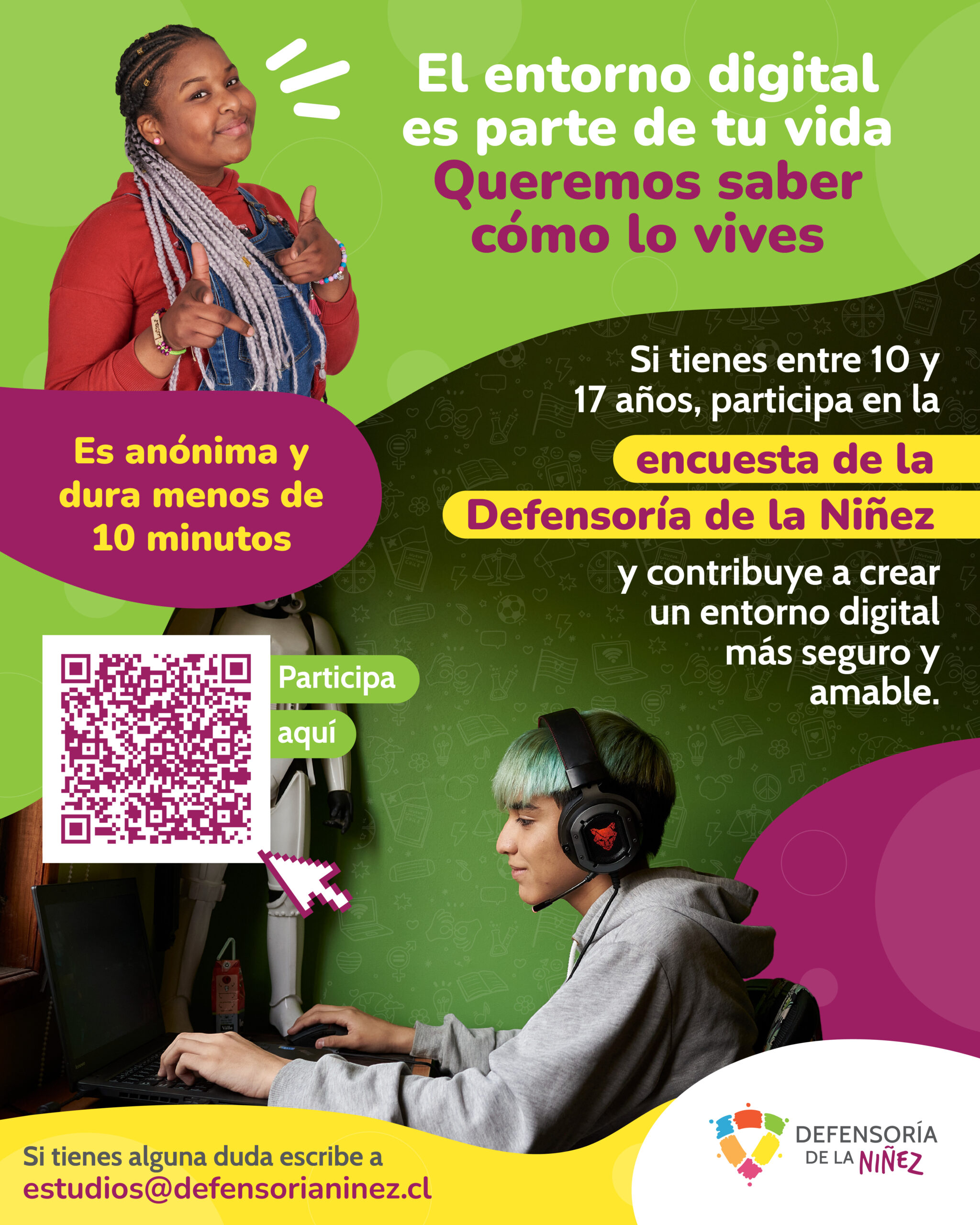 El estudio es de carácter cuantitativo y se ejecutó a través de la aplicación de encuestas a niños, niñas y adolescentes. Su objetivo fue obtener y analizar las opiniones, requerimientos e ideas de niños, niñas y adolescentes respecto a sus derechos y otras temáticas que les sean relevantes. Identificando el nivel de conocimiento que tienen respecto a sus derechos, las temáticas sociales y culturales que más les importan y determinando las expectativas e inquietudes que los niños, niñas y adolescentes tienen respecto a la sociedad, su presente, su futuro y las instituciones y políticas públicas con las que se relacionan. Dado los hechos generados después del 18 de octubre de 2019 y los efectos en la suspensión de clases y cierre anticipado del año escolar, es que el estudio se adaptó para continuar a través de la aplicación de encuesta a hogares, pudiendo complementar el análisis con la opinión de los niños, niñas y adolescentes sobre temáticas relacionadas al estallido social. Acceso al estudio y descargables